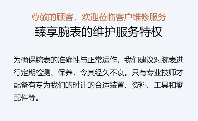 腕表维修、保养您可以直接留下您的需求和联系方式或拨打全国服务热线:400-6765-567随时为您解忧!